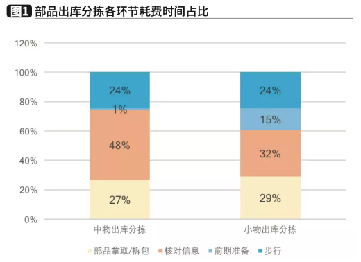由于信息化管理系统的限制,一直还在使用纸质出入库单和拣货单,依靠物流人员进行出入库和分拣的齐套工作,员工不仅要牢记所辖区域的部品存储情况,每人每天还要往复步行大约20km进行分拣齐套工作,作业效率低,劳动强度大。通过IE分析得出详细的数据,见图1。