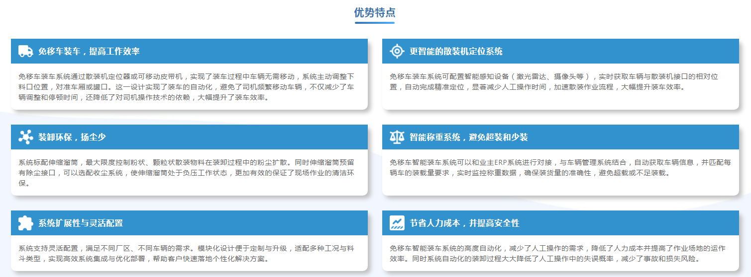 TG系列骨料免移车自动装车系统是一种高效、智能的自动化装车解决方案,专为颗粒/块料等散装物料的装车设计,广泛应用于建筑骨料、煤炭等大宗物料的装卸。该系统配备高精度的车辆扫描定位系统以及可移动皮带机,能够根据扫描信息自动调节皮带机的位置,将其精确对接到车厢上方。移动皮带机根据预定的速度和流量自动装载物料,沿车厢行走,均匀铺满车厢。整个装卸过程无需司机频繁移车,大幅提升装卸效率,减少人工操作,并确保高效、安全与环保。
