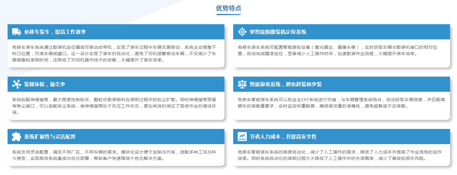 TF-M系列多罐口免移车智能装车系统是专为粉料运输设计的全自动解决方案,通过集成筒仓取料斜槽、气动开关阀、流量调节阀、固定延伸斜槽、一级旋臂斜槽、二级旋臂斜槽、除尘器、移动小车、移动大车、散装机等输送装置,实现罐车静止状态下一次性完成多个罐口的精准装料。该系统突破传统作业模式,配备可横向600mm精调、纵向 10米延伸的三维定位机构,结合智能散装机和动态除尘装置,能自适应匹配不同罐口位置与高度,在无需车辆移动的前提下完成50-300吨/小时的高效装载。极大提升装车效率,降低人工干预,保障装车安全性。