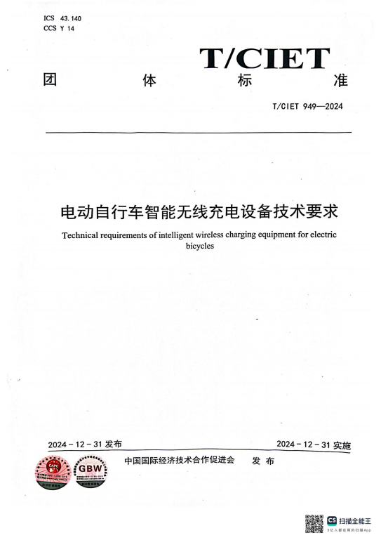 近日,由中国国际经济技术合作促进会正式发布的《电动自行车智能无线充电设备技术要求》(T/CIET 949-2024)团体标准进入实施阶段。作为该标准第一起草单位,中惠创智(深圳)无线供电技术有限公司凭借深厚的技术积累与行业影响力联合台铃科技、立马车业、武汉大学等知名企业与科研机构,共同推动了这一领域技术规范的制定与落地。