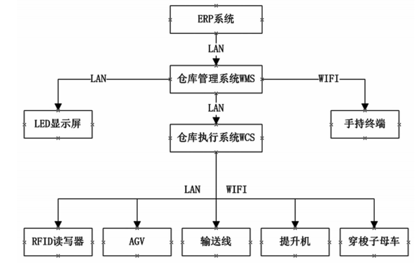 整个系统包含:RFID 信息处理读写系统、AGV 装运、入库输送系统(实现双向出、入库功能)、整垛机带尺寸检测、货物入库提升机、货架系统、认址条码、穿梭母车、穿梭子车、货物出库提升机、母车垂直输送机、出库输送系统、电器控制系统、信息管理系统(WMS 及 WCS)、监控调度系统。