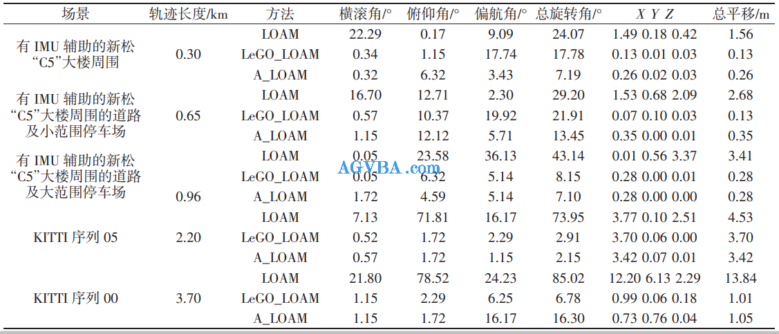 为验证地图的全局一致性,在此进行多次实验,将每个实验的初始位姿设置为[0,0,0,0]作为真值,在 LOAM、LeGO_LOAM 和 A_LOAM 算法中将移动机器人返回起始位置时计算的最终位姿数据取多次实验的平均值并导出,与真值进行对比,从而比较相对位姿估计误差,如表 1 所示。从表中可见,对于前四个场景,有 IMU 辅助的新松“C5”大楼周围的道路及停车场和序列 05 的一致性较好。在五个场景中,LeGO_LOAM 和 A_LOAM 的误差都相对较小。对于前三个场景,有 IMU 辅助的新松“C5”大楼周围道路及停车场中,LeGO_LOAM 和 A_LOAM 的误差在 1m以内。在新松“C5”大楼周围的道路中,LeGO_LOAM的位姿估计精度,相对于 LOAM,在平移和旋转上分别提高了 91.67%和 26.13%;A_LOAM 的位姿估计精 度 在 平 移 和 旋 转 上 分 别 提 高 了 83.33% 和70.13%;在新松“C5”大楼周围道路及小范围停车场中,LeGO_LOAM 的位姿估计精度在平移和旋转上分别提高了 95.15%和 24.97%;A_LOAM 的位姿估计精度 在平 移和 旋转 上分 别提 高 了 86.94% 和53.94%;在新松“C5”大楼周围道路及大范围停车场中,LeGO_LOAM 的位姿估计精度在平移和旋转上分别提高了 91.79%和 81.11%;A_LOAM 的位姿估计精度 在平 移和 旋转 上分 别提 高 了 91.79% 和83.54%;在序列 05 中,LeGO_LOAM 的位姿估计精度在平移和旋转上分别提高了 18.32%和 96.06%,A_LOAM 的位姿估计精度在平移和旋转上分别提高了 24.50%和 97.09%;在序列 00 中,LeGO_LOAM的位姿 估计 精度 在平 移和 旋转 上 分 别提 高 了92.70%和 92.03%。A_LOAM 的位姿估计精度在平移和旋转上分别提高了 92.41%和 80.83%。