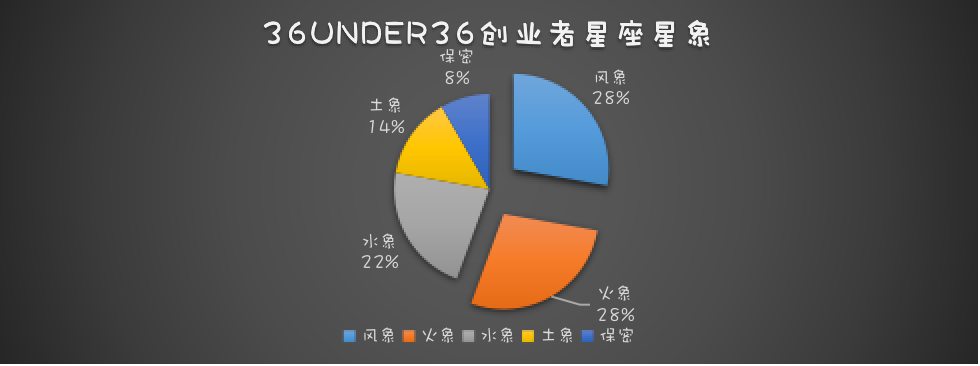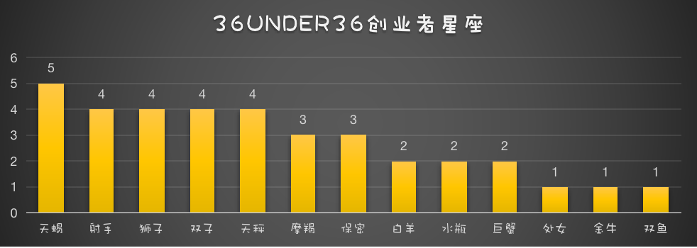 此次上榜创业者中,有5位创业者是“可爱又迷人的反派角色”天蝎座,该星座总数位列第一。紧随其后的是,风风火火搞事情的火象星座“射手、狮子”和天马行空、伶俐机智的风象星座“双子、天秤”,分别涵盖四位创业者。