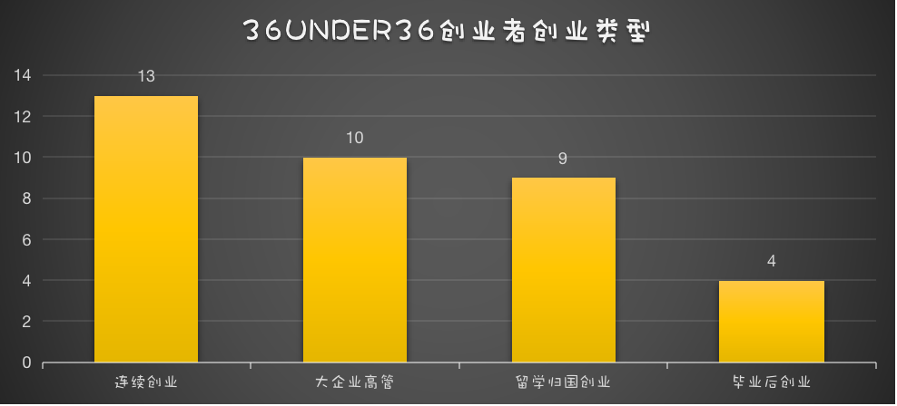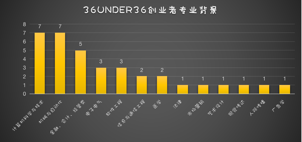 我们发现,上榜创业者所学习的专业中几乎为数理化相关,计算机科学与技术(7位),机械与自动化(7位),金融、会计和经管(5位),电子电气和软件工程分别有3位。同时,超过三分之一的创业者有连续创业经验。