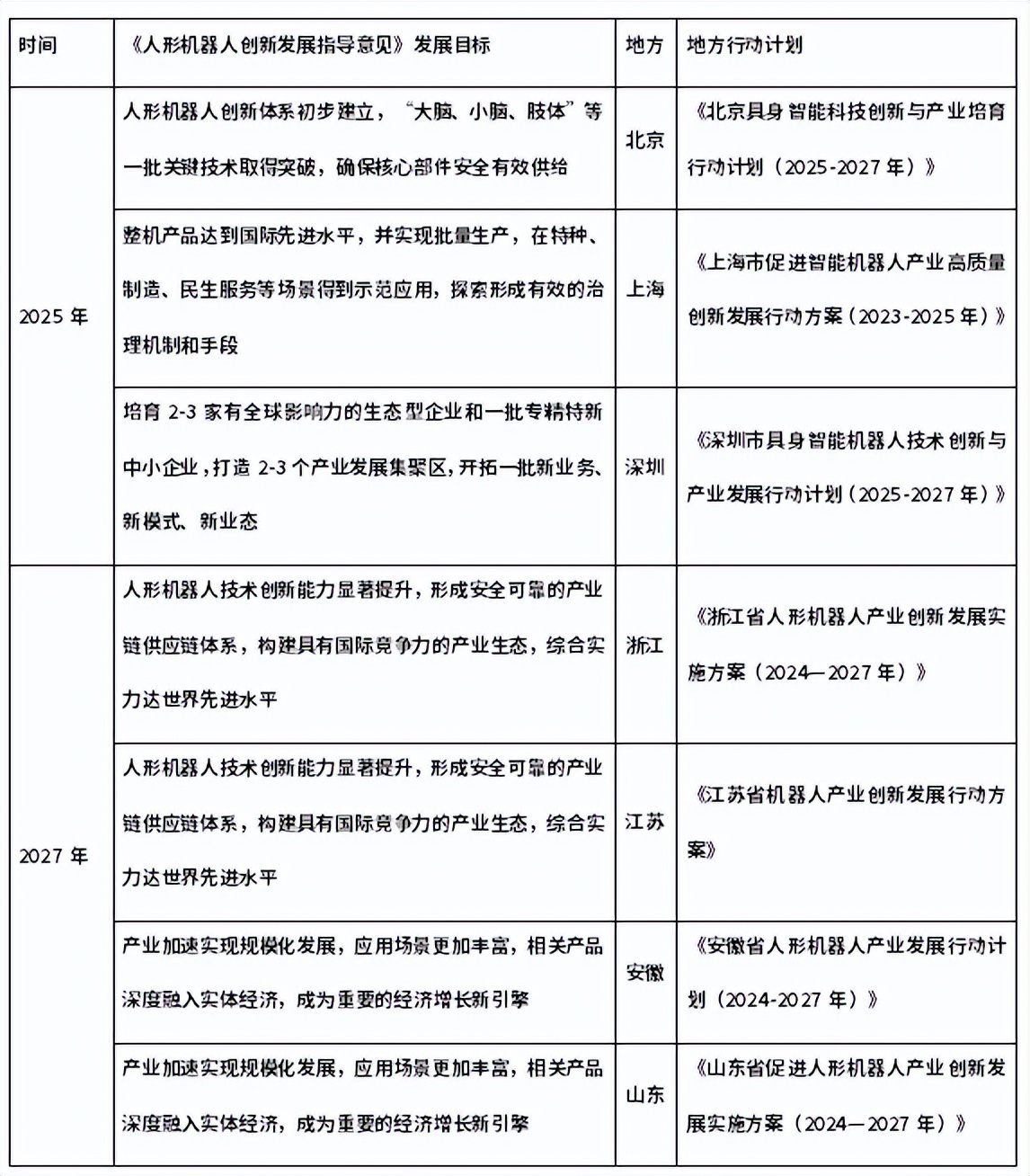 表1:《人形机器人创新发展指导意见》发展目标及地方行动计划