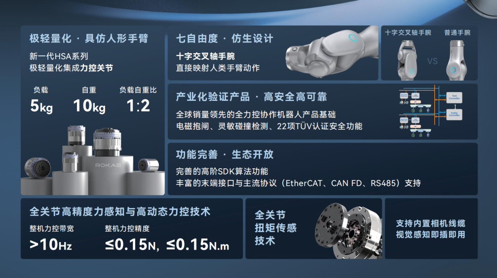 AR系列采用全关节力控技术,依托珞石在全力控协作机器人领域十余年的技术积淀,历经产业化验证,高安全、高可靠。同时支持内置相机线缆,配合完善的高阶SDK算法与丰富末端接口,可灵活赋能人形机器人、轮式双臂机器人等多种形态,广泛应用于人工智能、数据采集、学习训练及智能工厂等方向。