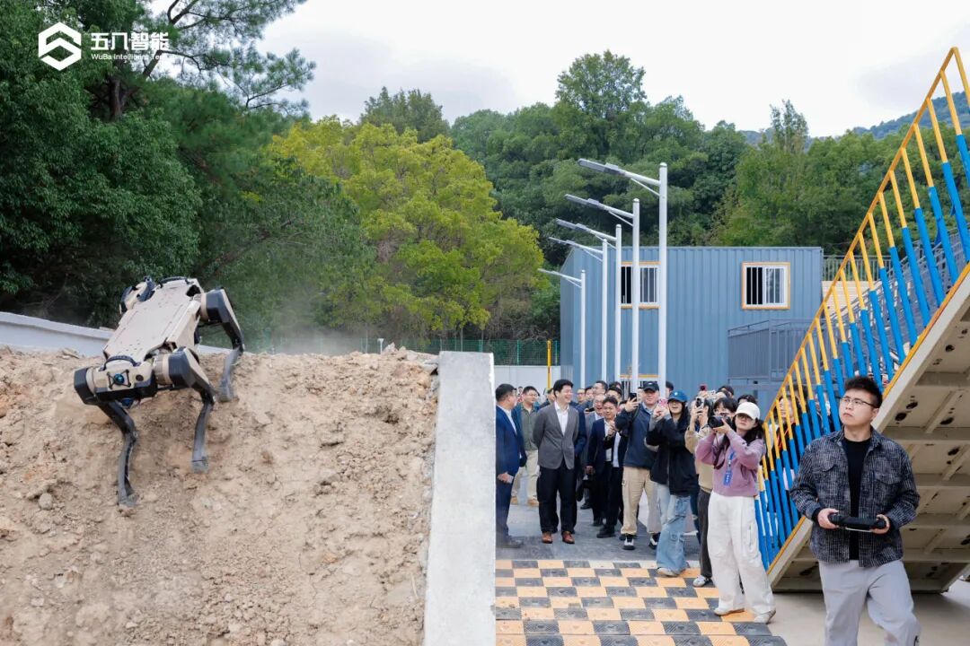 在室内测试区,嘉宾们实地考察了机器人精准测试设备与结构化测试场景;在户外场地,机器人在复杂地形中完成穿越、突破、巡逻等任务演示,展现出基地在机器人环境适应性与应用效能验证方面的强大能力。