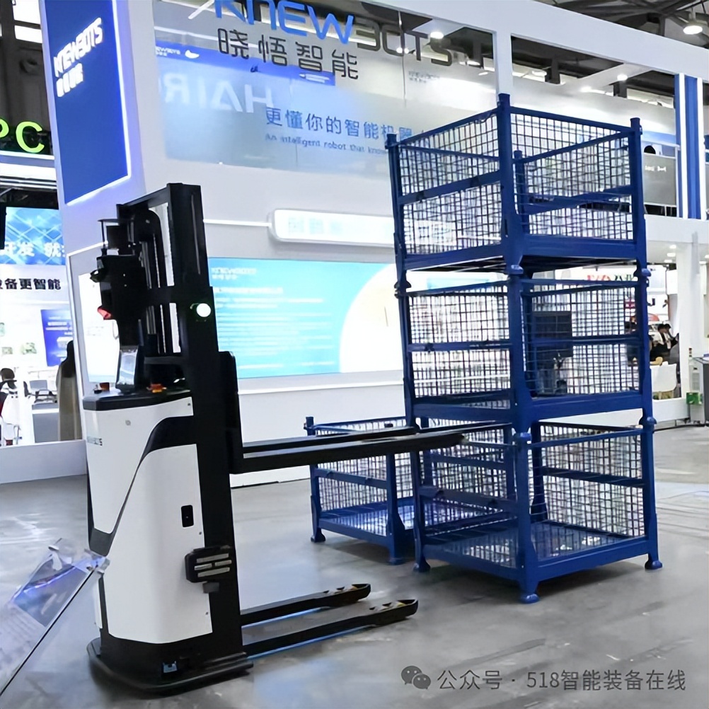针对仓储场景,晓悟智能还带来了GS系列堆高式无人叉车。赵振坤介绍,这款产品体积更小巧,通行灵活性更高,现场演示的4层料笼堆垛方案,生动诠释了“向天要空间”的仓储优化理念。“每一次堆垛的精准对齐,都离不开我们核心算法的支撑。”他透露,该产品搭载了自研高算力芯片平台主控制器,为后续加载更强AI模型预留了升级空间。