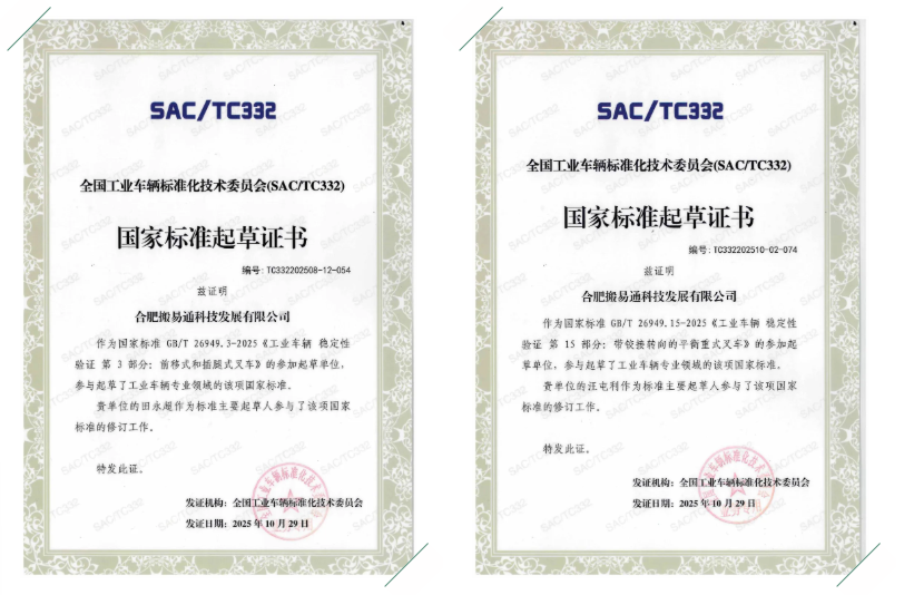 近日,合肥搬易通科技发展有限公司(MiMA)作为国家级专精特新“小巨人”企业,凭借其在工业车辆领域的技术积累,深度参与了国家标准起草工作,收到由全国工业车辆标准化技术委员会颁发的四项国家标准起草证书,为推动行业标准化、规范化和安全发展贡献了重要力量。