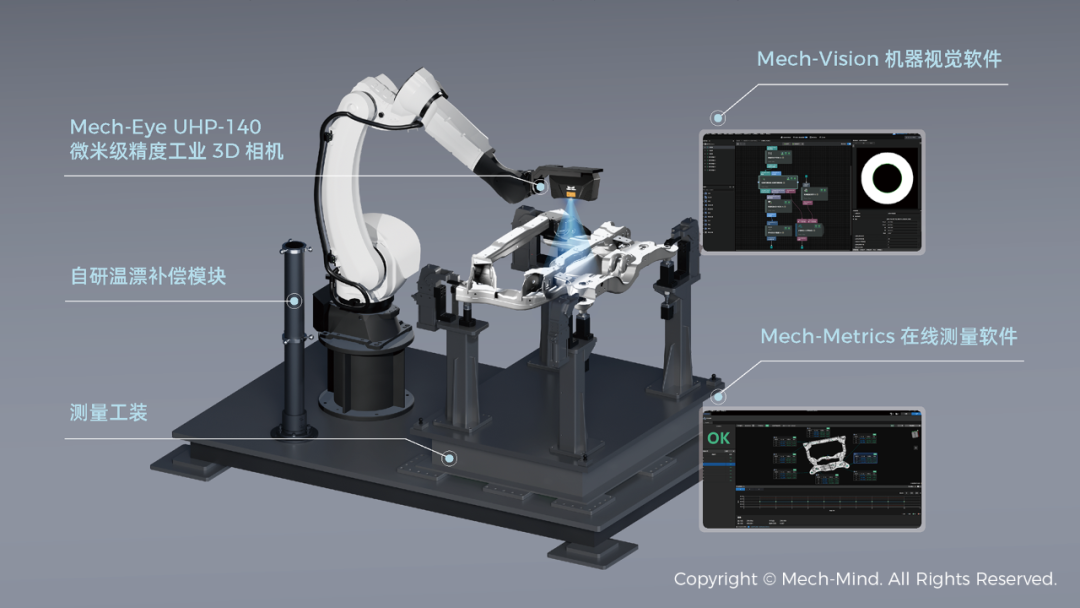 梅卡曼德在线测量系统集成了自主研发的Mech-Eye UHP-140微米级精度3D相机、Mech-Vision机器视觉软件、Mech-Metrics在线测量软件等高性能软硬件产品。