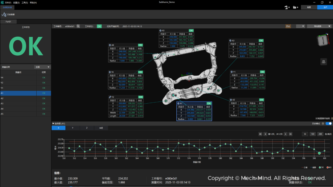 系统搭载的Mech-Metrics在线测量软件能够实时输出测量结果,记录每一个工件的所有关键尺寸数据。当出现质量问题时,客户可以通过产品序列号快速追溯至具体生产批次、时间乃至工位,实现问题的精准定位。