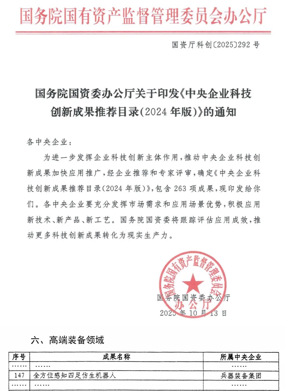 为进一步发挥企业科技创新主体作用,推动中央企业科技创新成果加快应用推广,经企业推荐和专家评审,国务院国资委办公厅近日印发《中央企业科技创新成果推荐目录(2024年版)》(以下简称《目录》)的通知,由五八智能自主研发的全方位感知四足机器人成功入选《目录》,是唯一一款入选高端装备领域的具身智能创新成果,为四足机器人在各行业加速应用探索路径、积累经验,提供可复制的成功范式。