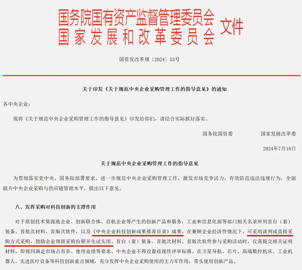 不久前,国务院国资委、国家发展改革委联合印发《关于规范中央企业采购管理工作的指导意见》(以下简称《意见》)。《意见》明确指出,要发挥采购对科技创新的支撑作用。对于原创技术策源地企业、创新联合体、启航企业等产生的创新产品和服务,工业和信息化部等部门相关名录所列首台(套)装备、首批次材料、首版次软件,以及《中央企业科技创新成果推荐目录》成果,在兼顾企业经济性情况下,可采用谈判或直接柔购方式采购,鼓励企业预留采购份额并先试先用。在卫星导航、芯片、高数控机床、工业机器人、先进医疗设备等科技创新重点领域,充分发挥中央企业采购使用的主力军作用,带头使用创新产品。