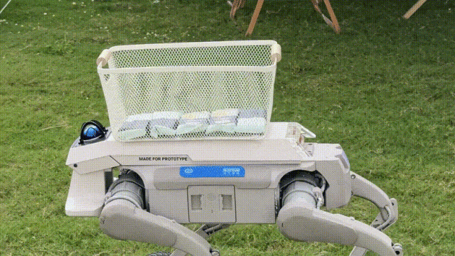 该机器狗采用基于强化学习的主动抗扰算法及高扭矩关节,确保在复杂动态环境中抵御外力干扰,保持稳定姿态,可实现全地形自主运动。其采用高强度机身骨架与抗冲击设计,整机防护等级达 IP54,关节耐腐蚀,并支持 0~40°C 宽温域运行。这些特性确保了产品能够在各种严苛的室内外场景中稳定工作,执行物料、工具等物品的自动配送任务。