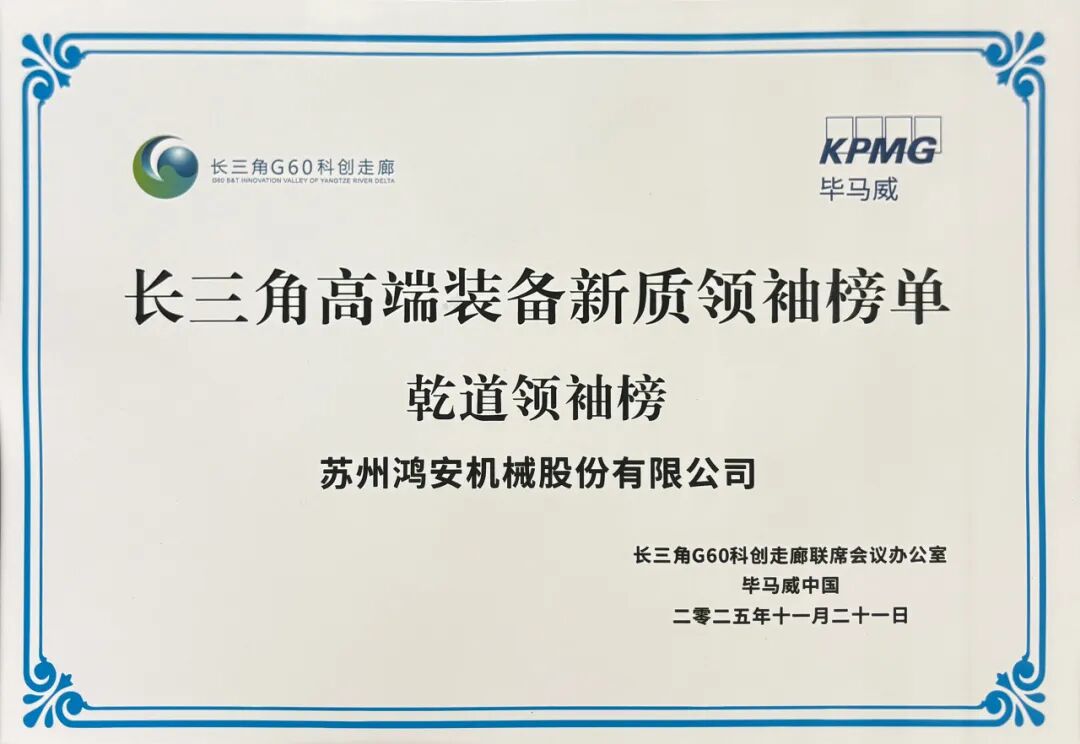 2025年11月21日,于G60创新研究中心联合毕马威中国共同举办的长三角高端装备新质领袖榜单发榜仪式上,鸿安凭借卓越的技术实力与突出的成长潜力,成功入选“乾道领袖榜”。