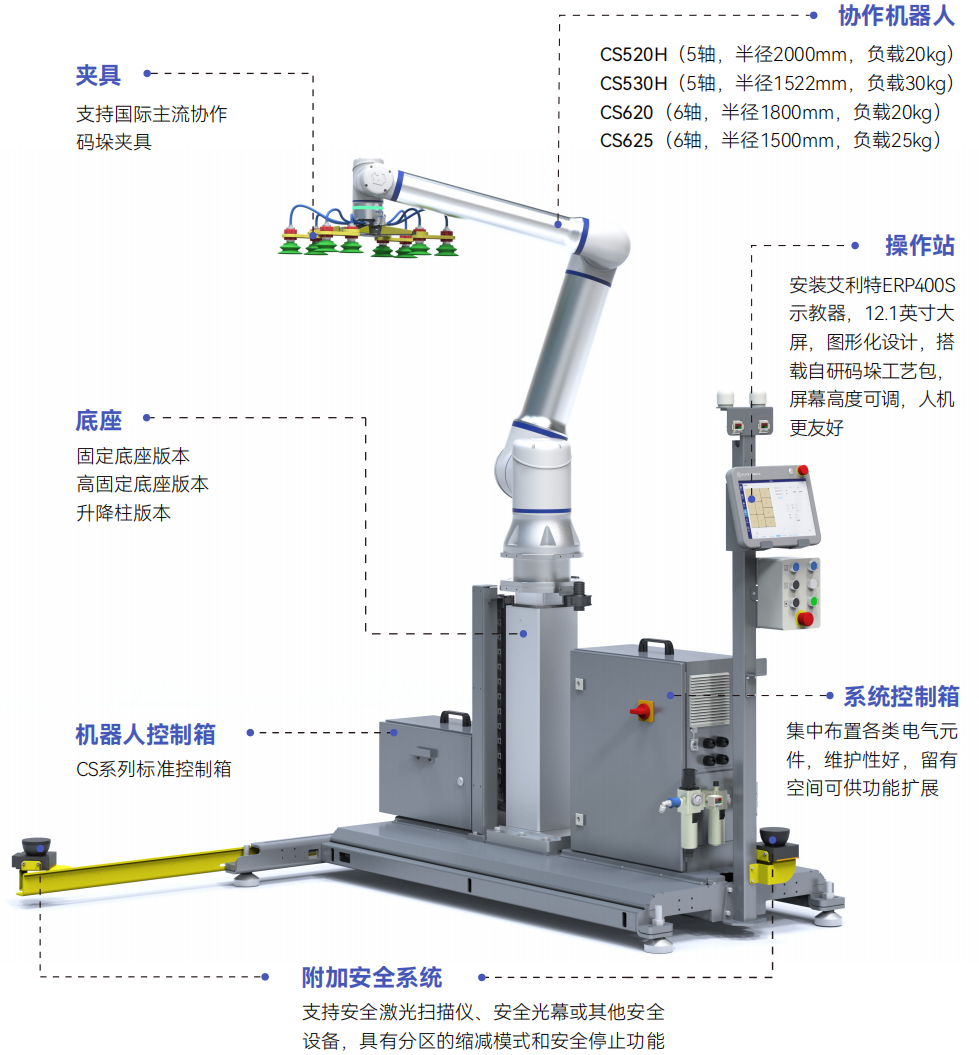 深入洞察这一底层痛点,艾利特将协作机器人的灵巧作业能力与智能升降技术深度融合,推出的CP系列模块化协作码垛工作站,打破了传统自动化设备在空间与功能上的刚性约束,以“高柔性、高效率、快部署”三大突破,重新定义码垛自动化范式。
