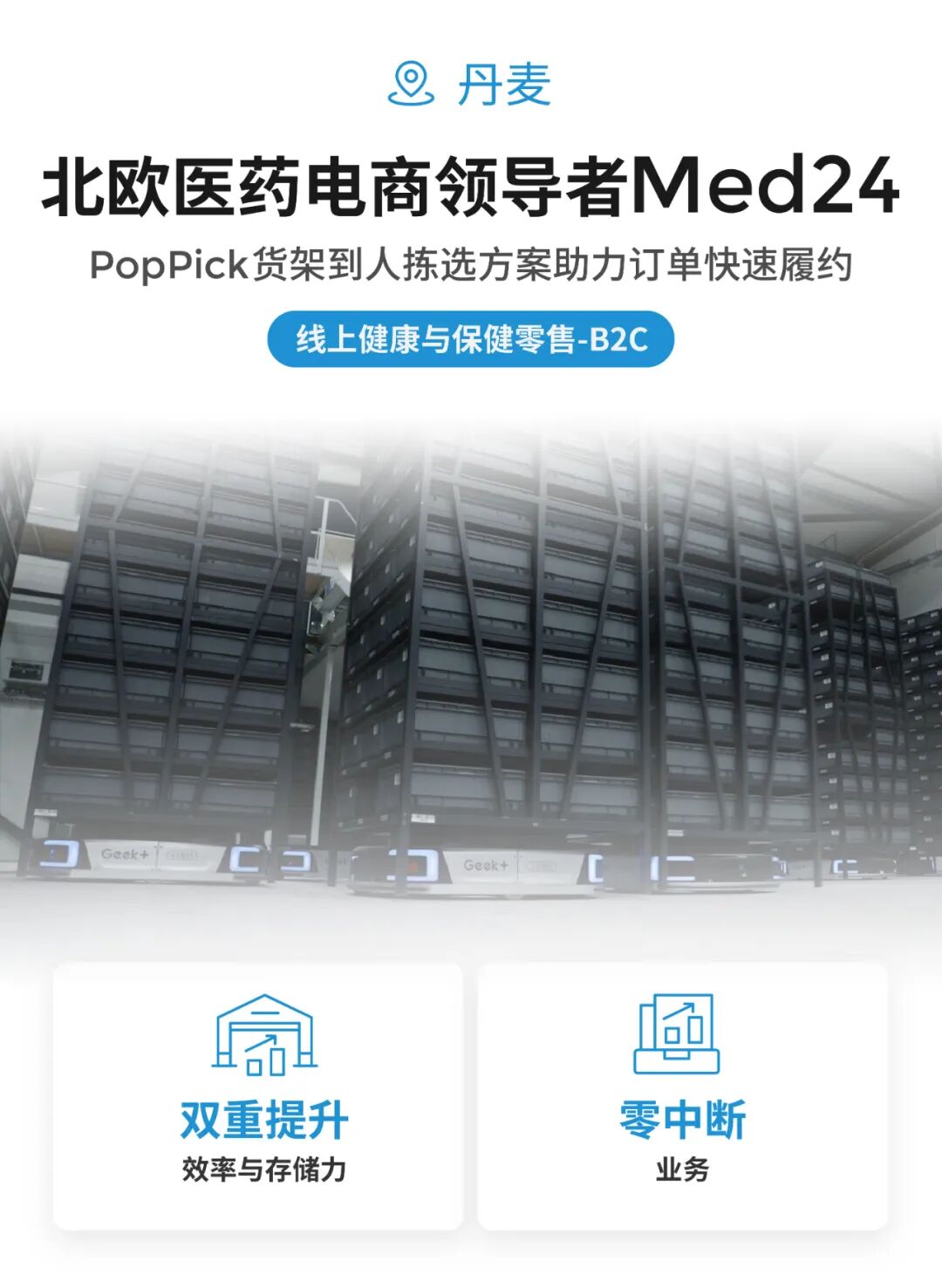 在丹麦,北欧医药电商领导者Med24在仓库中成功部署PopPick货架到人方案,在业务零中断的同时,实现效率与存储力的显著提升,助力Med24成为北欧医药健康行业的领先典范。
