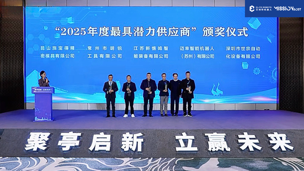 在这场以“聚亭启新·立赢未来”为主题的行业盛会上,艾利特智能机器人股份有限公司——迈幸机器人(迈幸智能机器人(苏州)有限公司)凭借在复合机器人领域的创新实力和卓越表现,荣获“2025年度最具潜力供应商”称号。这份殊荣,是立铠精密对迈幸机器人技术硬实力的权威背书,亦是对双方“深度协同、价值共生”合作伙伴关系的生动注脚。