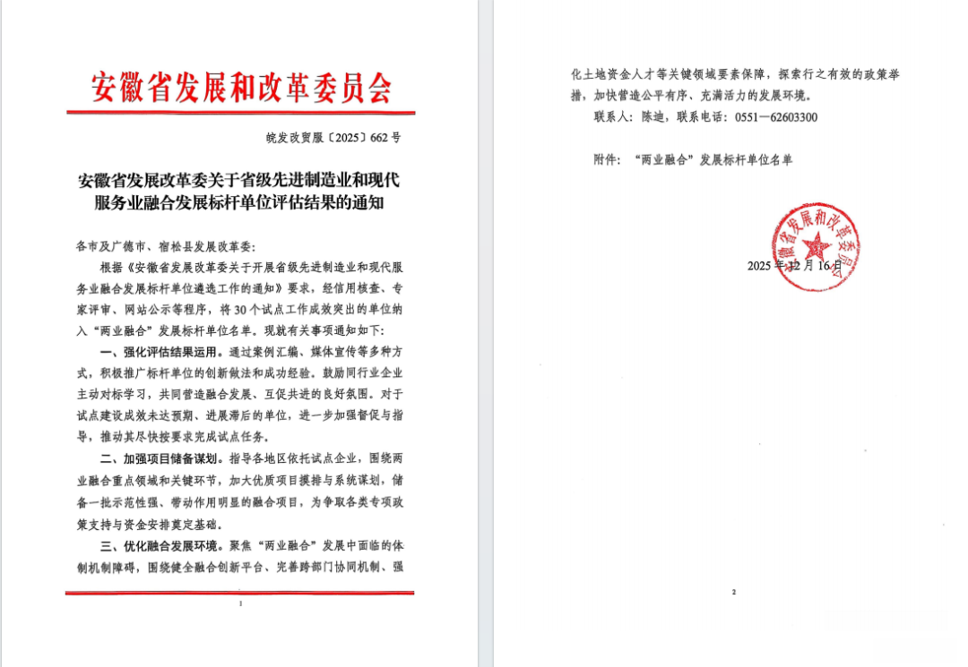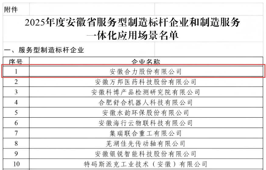 近日,安徽省发改委、安徽省工信厅分别公布《关于省级先进制造业和现代服务业融合发展标杆单位评估结果的通知》《关于公布2025年度服务型制造标杆企业和制造服务一体化应用场景名单的通知》,合力成功入选安徽省“两业融合”发展标杆单位和服务型制造标杆企业。此次成功入选“双标杆”企业,标志着公司从传统工业车辆制造商向“制造+服务”综合解决方案提供商转型获得显著成效。