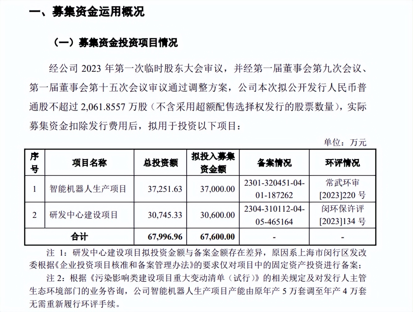在新增产能方面,根据上会版招股书,节卡机器人本次拟公开发行人民币普通股不超过2,061.8557万股,募集资金从此前的7.5亿元调整为6.76亿元,扣除发行费用后用于投资智能机器人生产项目、研发中心建设项目。其中,智能机器人生产项目的产能规划有所下调,由原计划的年产5万套调至年产4万套。