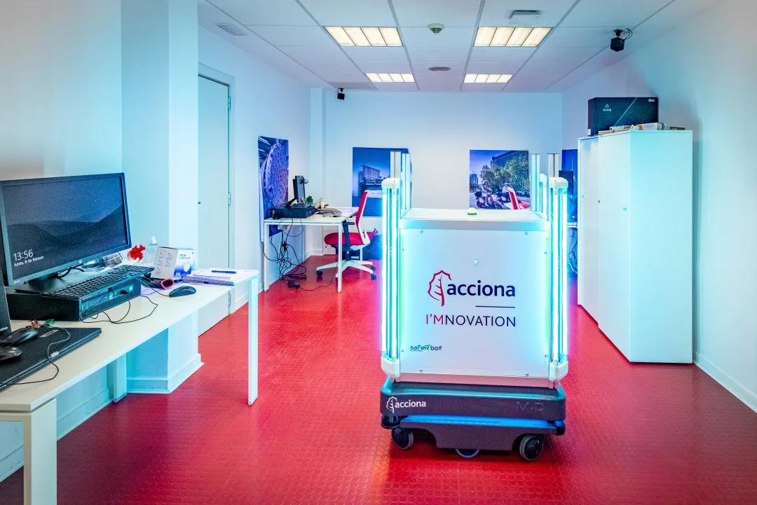 Carlos 补充道:“感谢 Robotplus 和 MiR,我们拥有了自动化生物消毒解决方案。它不仅适用于我们自己的工厂,还能集成到我们为客户提供的一系列服务之中。”目前,Acciona 使用 SafeRBot 机器人对创新中心和集团总部的办公室进行消毒,并将第三台机器人送到卡塔尔的企业服务部门,在当地的 14 家医院中进行消毒工作。