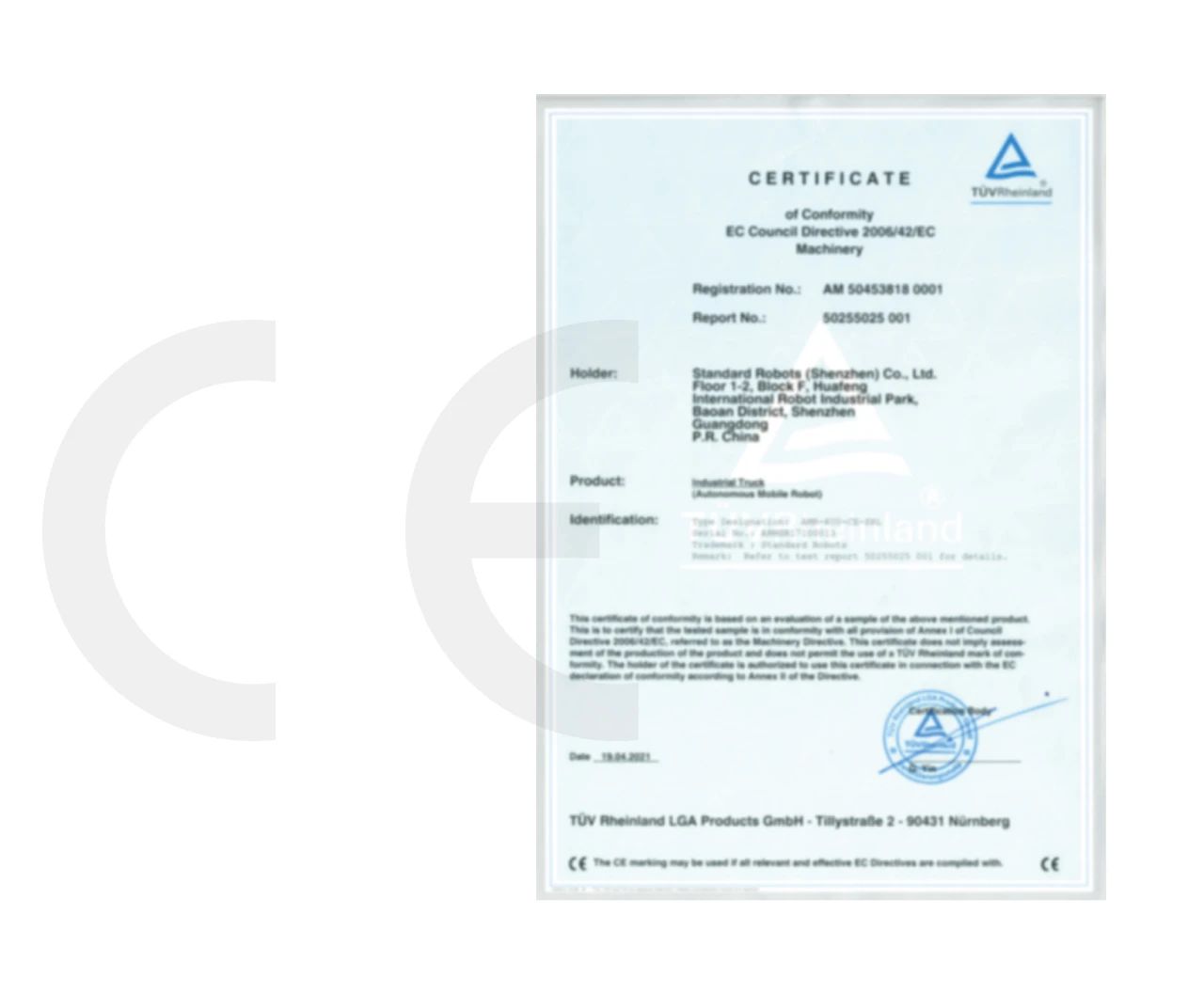 TÜV莱茵近日宣布,斯坦德机器人旗下采用激光SLAM导航的AMR 600-CE/SRL通过欧盟CE认证。斯坦德以安全可靠的产品引领自主移动机器人行业发展,为中国智造打开欧盟市场、走向世界奠定坚实基础。
