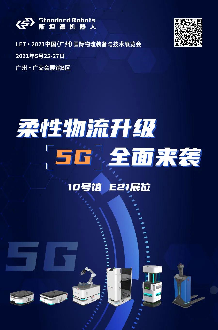 5.25-5.27, LET 2021中国(广州)国际物流装备与展览会即将在广州拉开帷幕,斯坦德机器人携厂仓一体化物流解决方案,现场为大家展示制造业物流在5G环境下如何「数智升级,降本增效」。