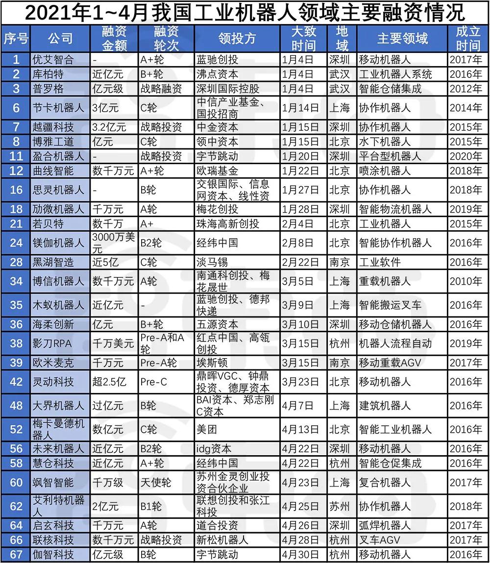 仅是在刚刚过去的1~4月,国产机器人企业投资已经达到67起,累计金额超过100亿人民币,其中金额过亿的单笔融资足足有30起以上。