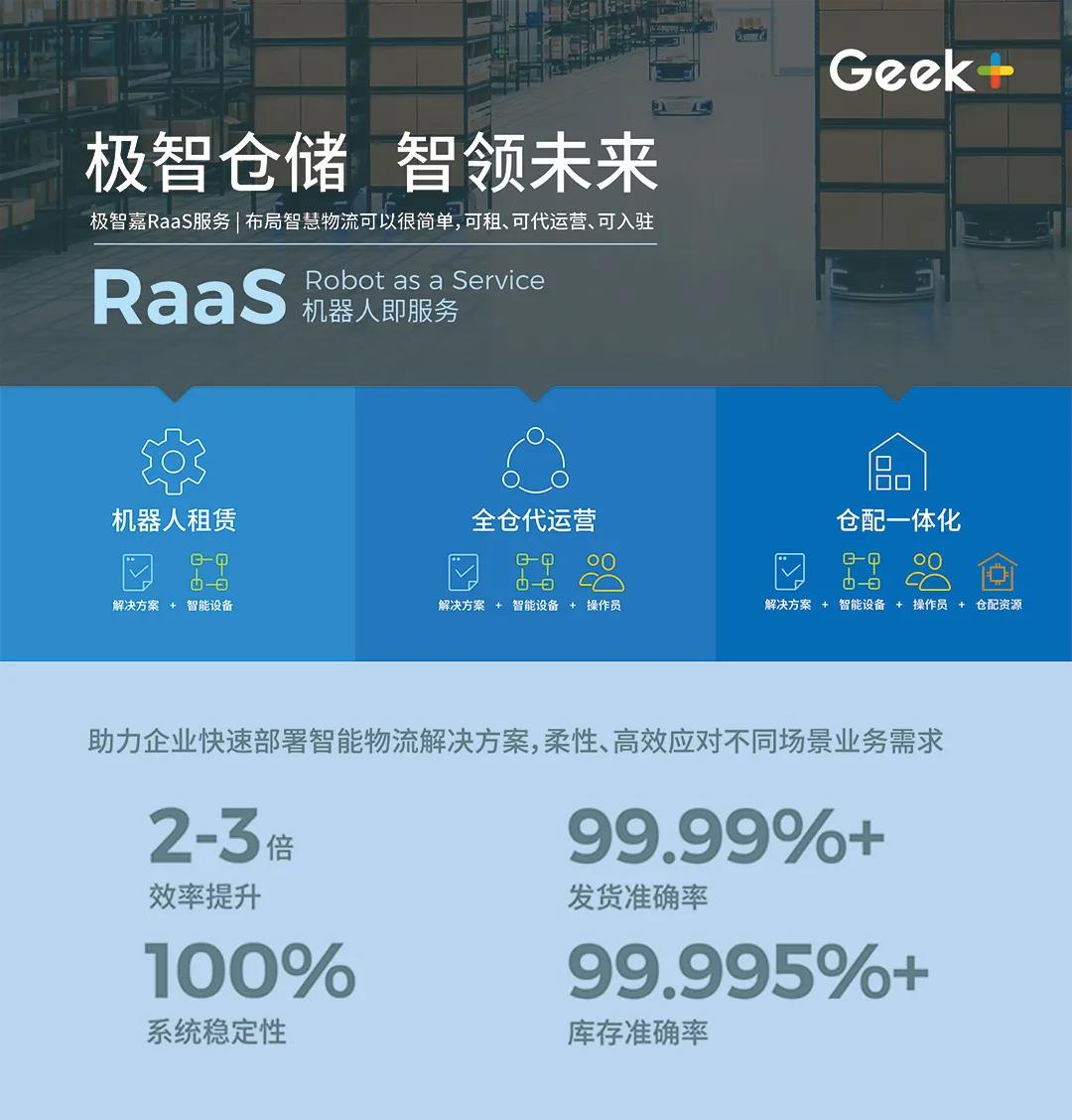 RaaS是极智嘉于2018年在业内首次提出的灵活创新商业合作模式,让企业不仅可采购,还可选择机器人租赁、全仓代运营和仓配一体化智能仓服务,降低企业部署机器人系统的资金和能力门槛,助力更加快速实现供应链升级改造。