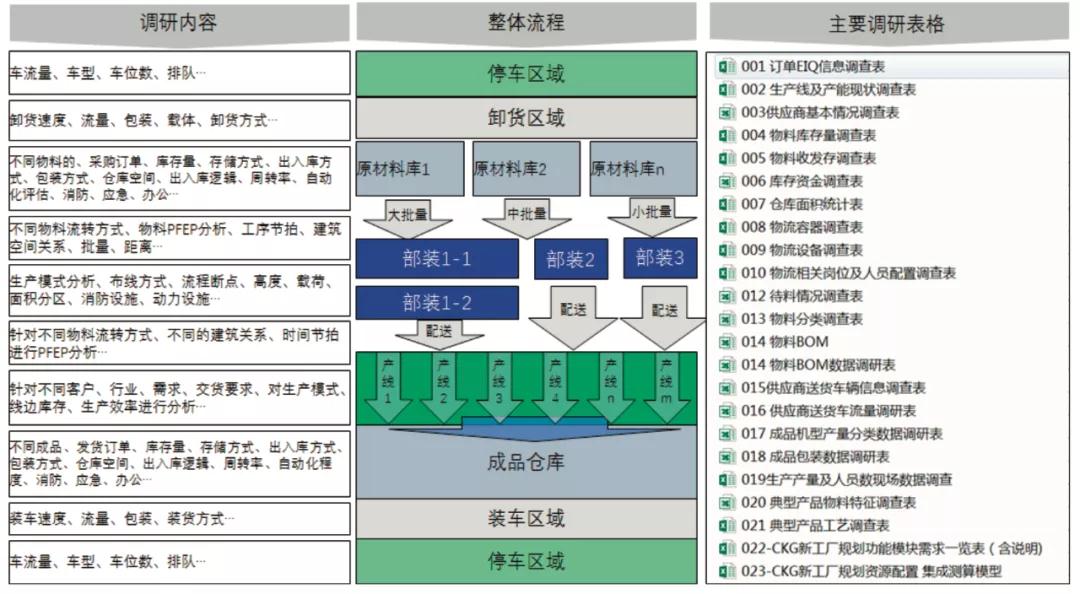 需求梳理方法主要有现场调研、人员访谈、问卷调查、数据收集、会议讨论、现有文件审查等。调查不仅仅是针对物流部门,而需要调研整个工厂的运营体系,不同部门对现状问题的理解不尽相同。同时,设计相应表格收集数据,这些表格需要具有一定的逻辑和相互关系,收集的数据量、覆盖周期、覆盖范围等都需要定义清晰,以确保数据收集的有效性。