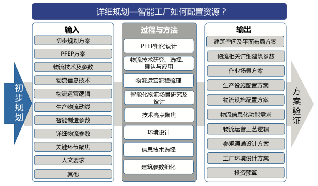 在初步规划的基础上,详细规划结合初步规划方案、具体的PFEP方案、物流技术及参数(比如搬运技术、存储技术、拣选技术等)、物流信息技术、物流运营逻辑、生产物流动线、智能制造参数、详细物流参数、关键环节聚焦、人文要求等,通过细化设计的PFEP,对物流技术进行研究、选择、确认及应用,对物流流程进行梳理、对智能化物流场景开展研究及设计、对环境进行设计、选择信息技术并对建筑参数进行细化等,最终输出详细规划方案。以物流为主线的智能工厂详细规划模型如图5所示: