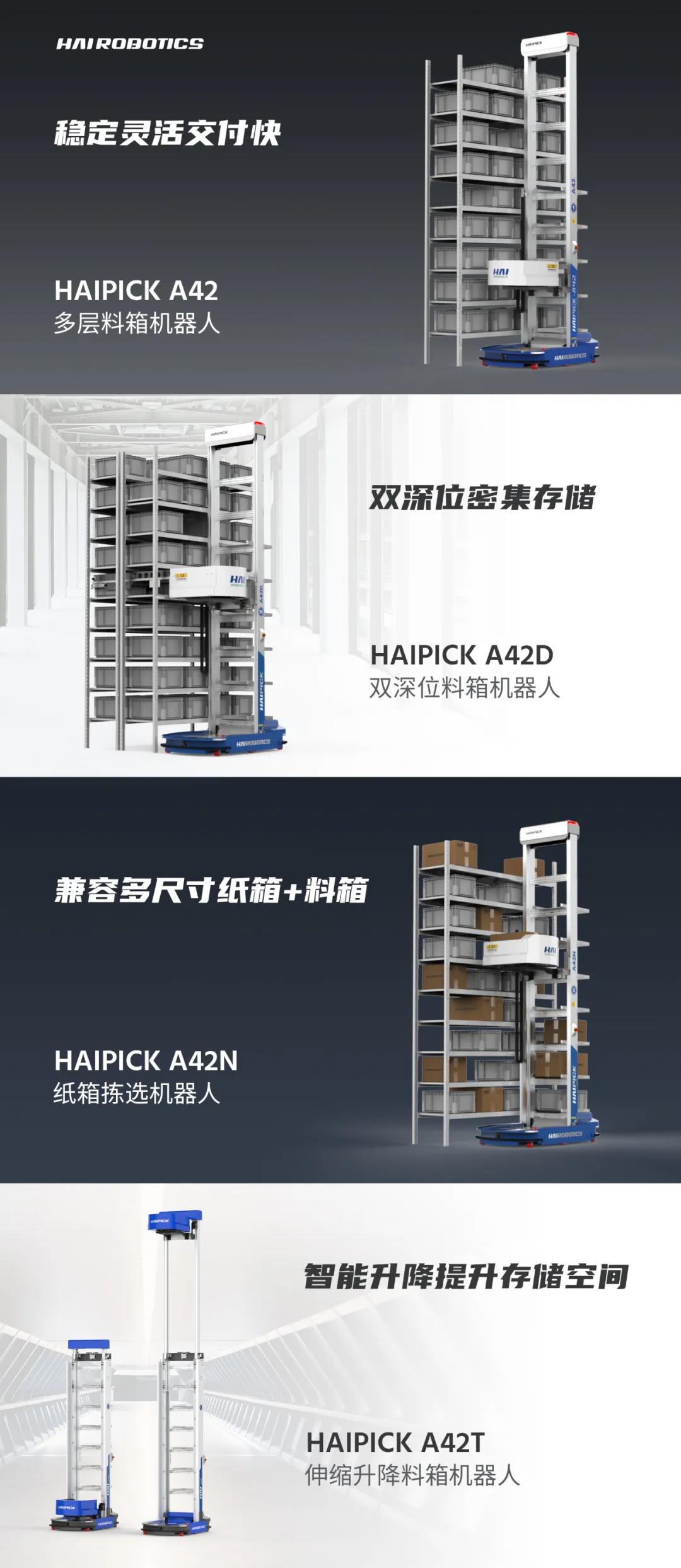 迄今为止,海柔创新已经迭代出HAIPICK A42(多层料箱机器人)、HAIPICK A42D(双深位料箱机器人)、HAIPICK A42N(纸箱拣选机器人)、HAIPICK A42T(伸缩升降料箱机器人)、HAIPICK A42SLAM(激光SLAM料箱机器人)等不同形态的机器人,针对不同的仓储环境,为客户解决其痛点、难点。