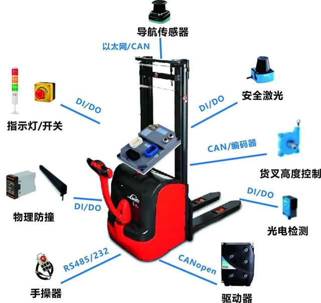 以激光自然导航方式为例,以MRC5000为核心,通过以太网接入倍加福R2000传感器,通过DI/DO接入主要的安全架构,辅助结构等,通过CAN接入驱动器等,完成整台AGV的导航控制系统。