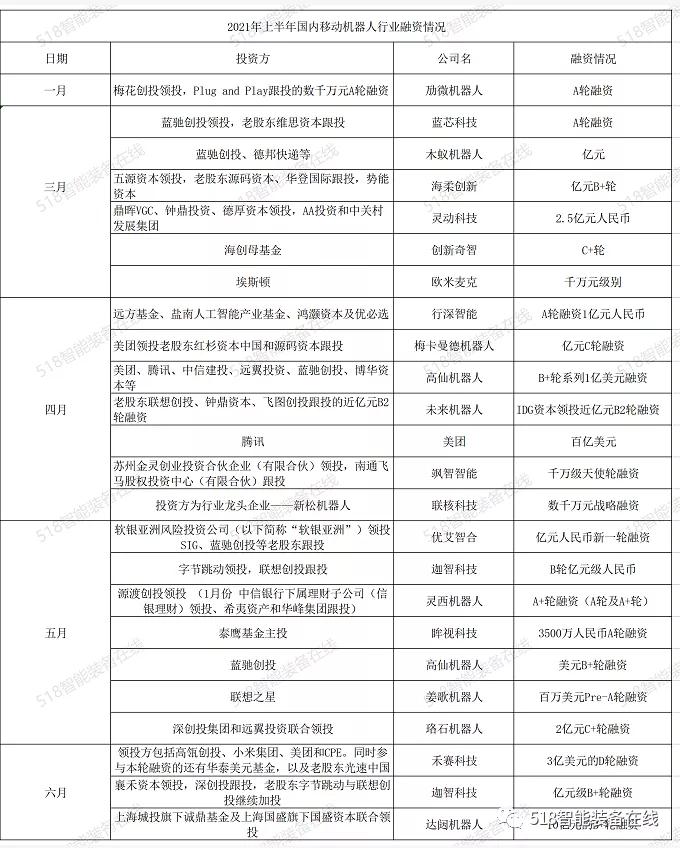 据518智能装备在线不完全统计,截止6月底,2021年上半年国内移动机器人产业领域共发生投融资事件约23起22家企业,其中,亿元人民币级别的有14起,占60%。