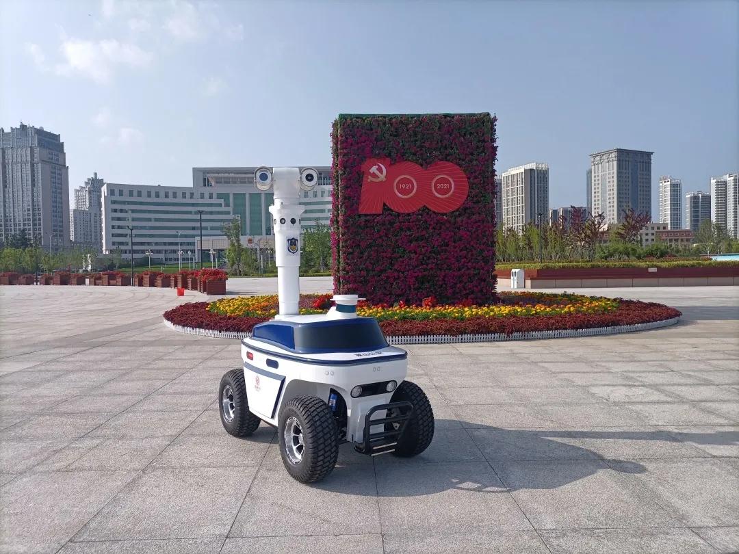 “喜迎建党100年,祖国儿女齐欢庆”,在市民广场,巡逻的机器人警察正号召大家共同学习党史。巡逻机器人具有车规级底盘,包含阿克曼后驱底盘以及四轮独立减震系统,最高时速可达到10km/h,越障高度可达15cm。同时,机器人还搭载了5路高清视频及高精度红外热成像,全景云台高度最高可升至1.8m,可实现360°无死角覆盖。机器人作为警务助手,在成为在岗民警“千里眼”和“顺风耳”的同时,还是“小喇叭”,可以开展反诈、禁毒等宣传教育,强化群众安全意识。