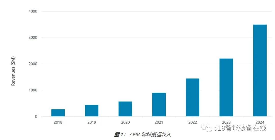 事实上,最近的研究表明,在美国的 160 万仓库员工中,只有一半在进行单件或物品的处理。这说明了大型物料搬运移动机器人取代人工是必然的。这一趋势在移动机器人方面得到了很好的反映——为非标拣选应用设计的机器人去年实际上占 AMR 收入的 52%。此外,根据我们的分析, AMR 的收入预计到 2024 年将达到 35 亿美元(图 1)。
