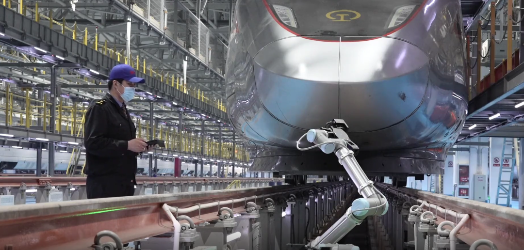 北京动车段朝阳动车所的检修库有两条股道内铺设了专用轨道,两台搭载 SRC-2000 移动机器人控制器的复合智能检测机器人,可同时为两组智能复兴号动车组智能检测车底走行部位的设备和配件情况。