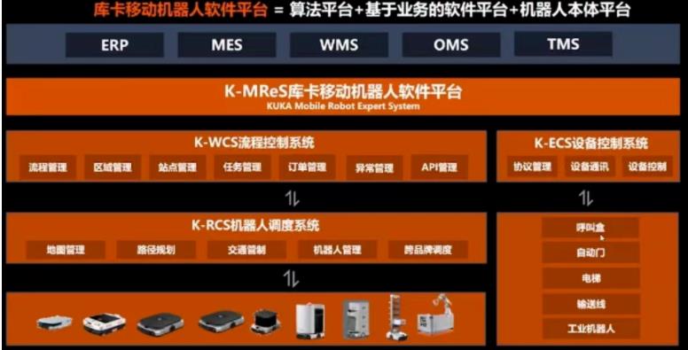 库卡移动机器人软件平台相当于“算法平台+基于业务的软件平台+机器人本体平台”,上可以对接客户的ERP、MES、WMS等业务系统软件,下可对接流程控制系统和机器人调度系统,两者可以更好相互融合。