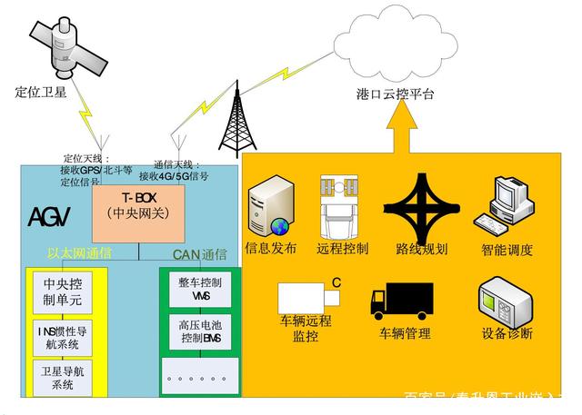 TBOX作为AGV车载通讯终端,主要功能是作为中央网关完成车内网和移动网络(5G,向下兼容4G)的通讯,并完成通讯安全防护、信息交互、高精度定位等功能,通过内置的SIM卡与运营商连接通讯。在信息交互方面与车内各ECU相互通信,接收车内其他ECU发出的信息,包括车辆基本信息、车辆状态信息、车辆故障信息等,同时将来自于港口云控平台控制指令发送给各个相关ECU实现相应的控制。T-BOX需要内置高精度定位模块,用于车联网系统定位