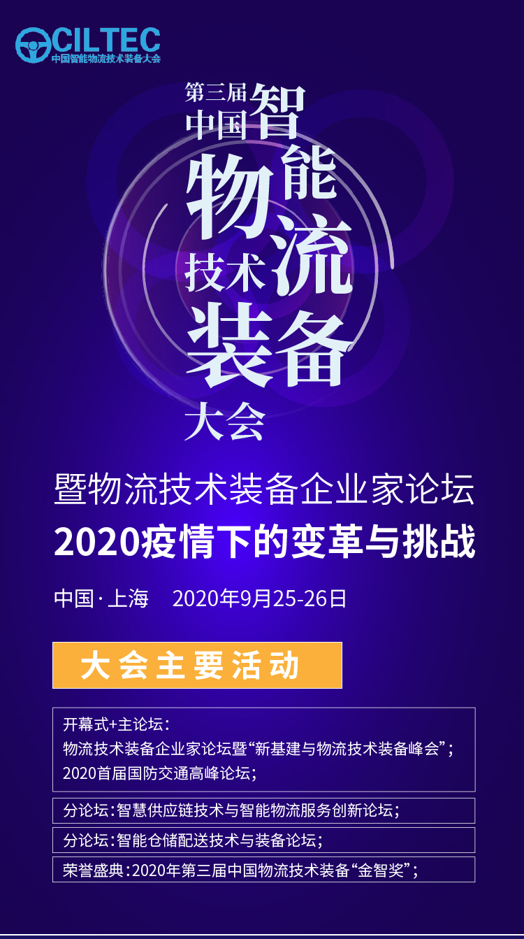 2020(第三届)中国智能物流技术装备大会暨物流技术装备企业家论坛定于9月25-26日将在上海召开;本次大会由中国交通运输协会主办,中国交通运输协会物流技术装备专业委员会和北京中交企联文化传播有限公司共同承办。
