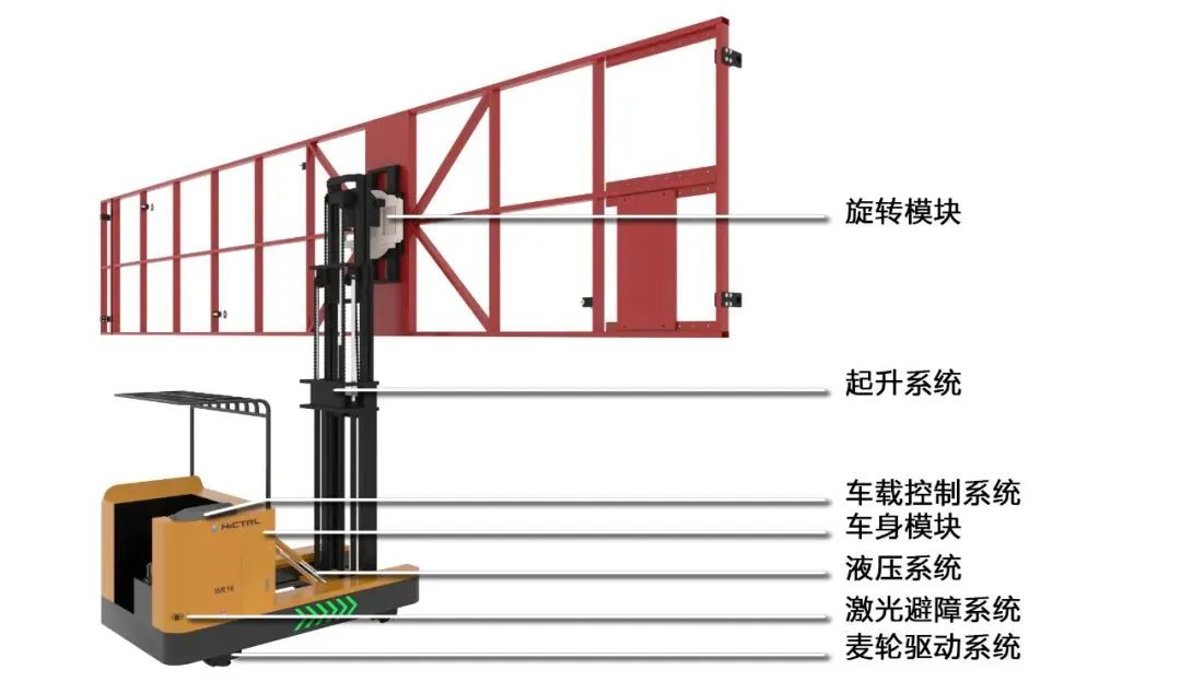 墙板安装专机是在OMV前移式叉车上安装旋转器与工装架对接安装,采用麦克纳姆轮技术,使车辆可以任意方向移动,包括直行,横向移动。