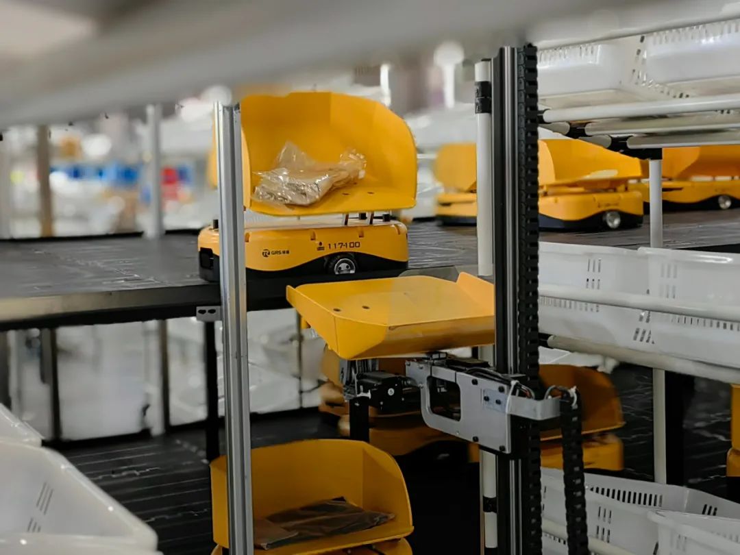 在分拣工作区,小黄人们在双层桌面上快速穿梭,通过扫描商品上方条形码,精准地将一件件服饰转运至3D分拣机前,由分拣机将其投入指定投递篮,完成最终的多件订单合并与分拣。