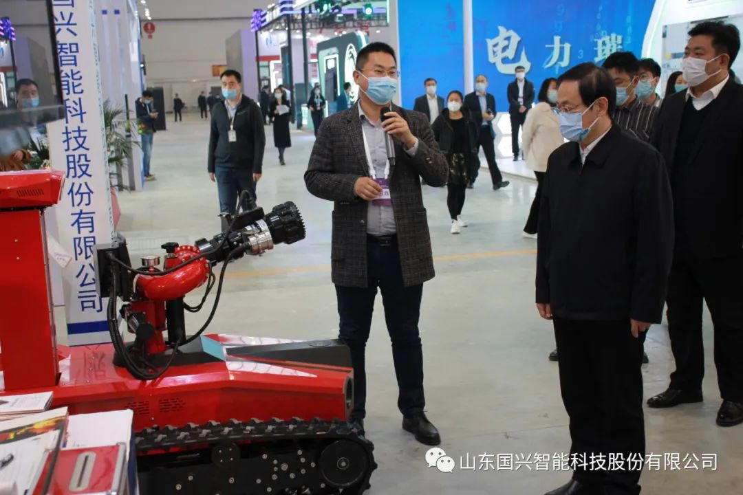也正是因为国兴智能不断在智能化、数字化方向不断前行,在活动期间,吸引了诸多领导来到展位前参观。在9日当天,山东省工业和信息化厅党组书记、厅长张海波来到国兴智能展位前参观指导,在听完国兴智能的企业介绍与产品介绍之后,对国兴智能在消防机器人领域智能化、信息化、无人化方向发展给予肯定。