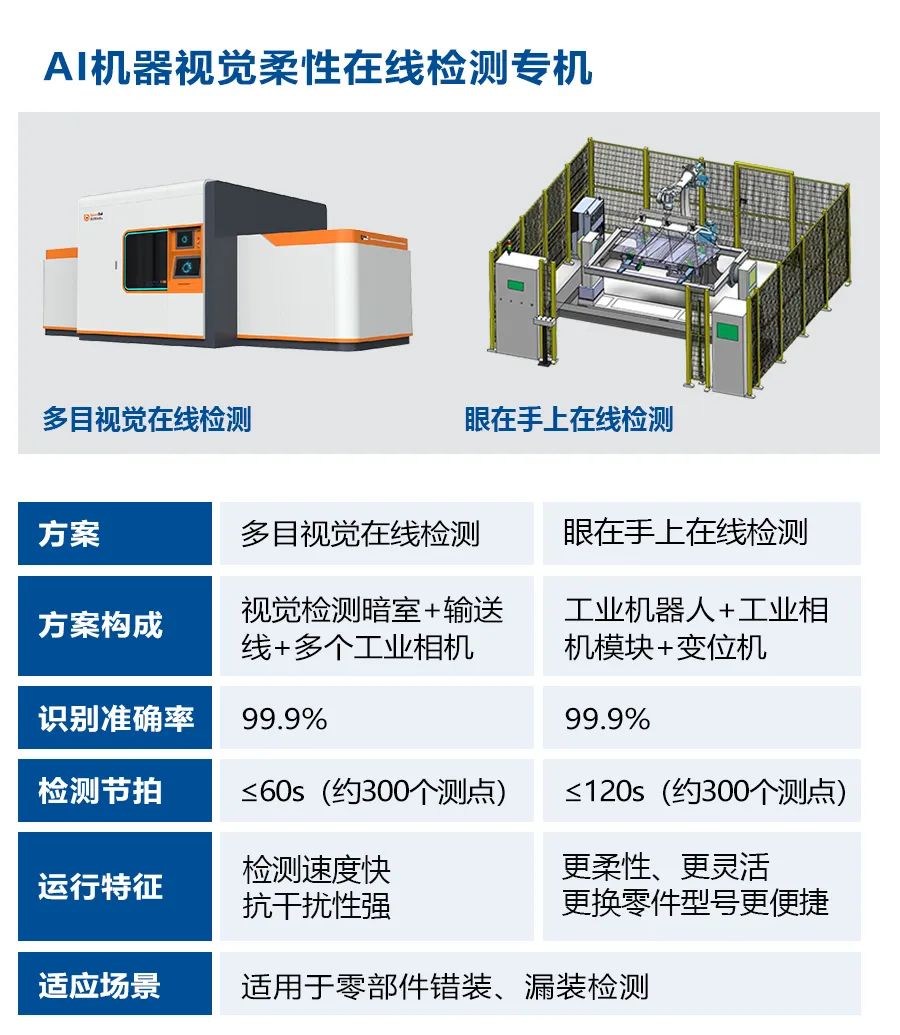 本产品包含多目视觉在线检测和眼在手上在线检测两种方案。其中多目视觉在线检测采用相机固定安装方式,基于多个相机全视角取图实现工件的高效检测。眼在手上在线检测则采用2D/3D相机安装在机器人末端的方式,在相机和工件的协同运动中完成工件的柔性、高效检测。