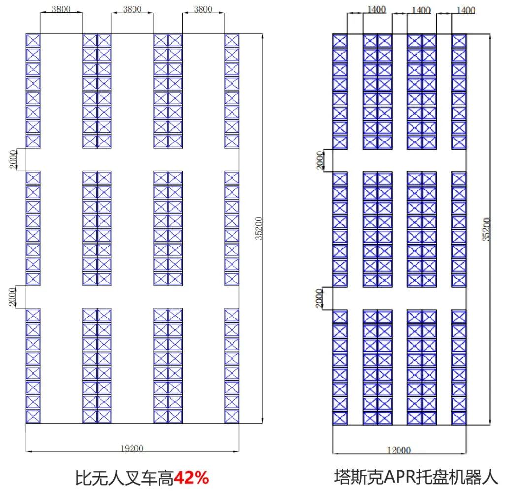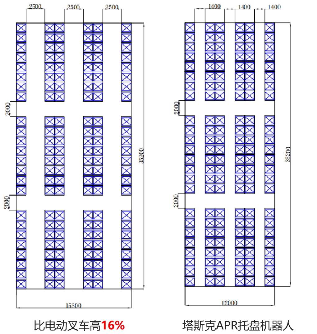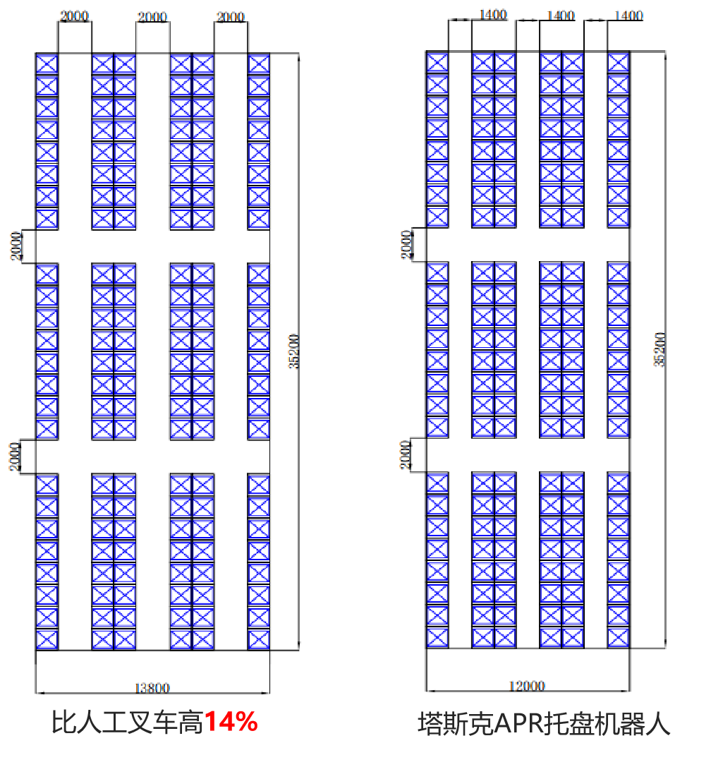 通过对比,塔斯克托盘机器人库容率比人工叉车、电动叉车、无人叉车分别高14%、16%、42%,具有明显优势。