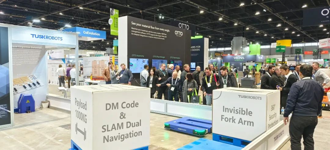 本次参展,塔斯克机器人以动静结合的形态首次盛装亮相,独具创新性的APR托盘机器人主动伸出叉臂取货,并将货物稳定运行至指定的库位卸货。同时,塔斯克托盘机器人可实现360°避障检测,具有高安全性、窄道通行、高负重比等优势,吸引众多国外观众、媒体及行业专家驻足交流,引起广泛的关注。