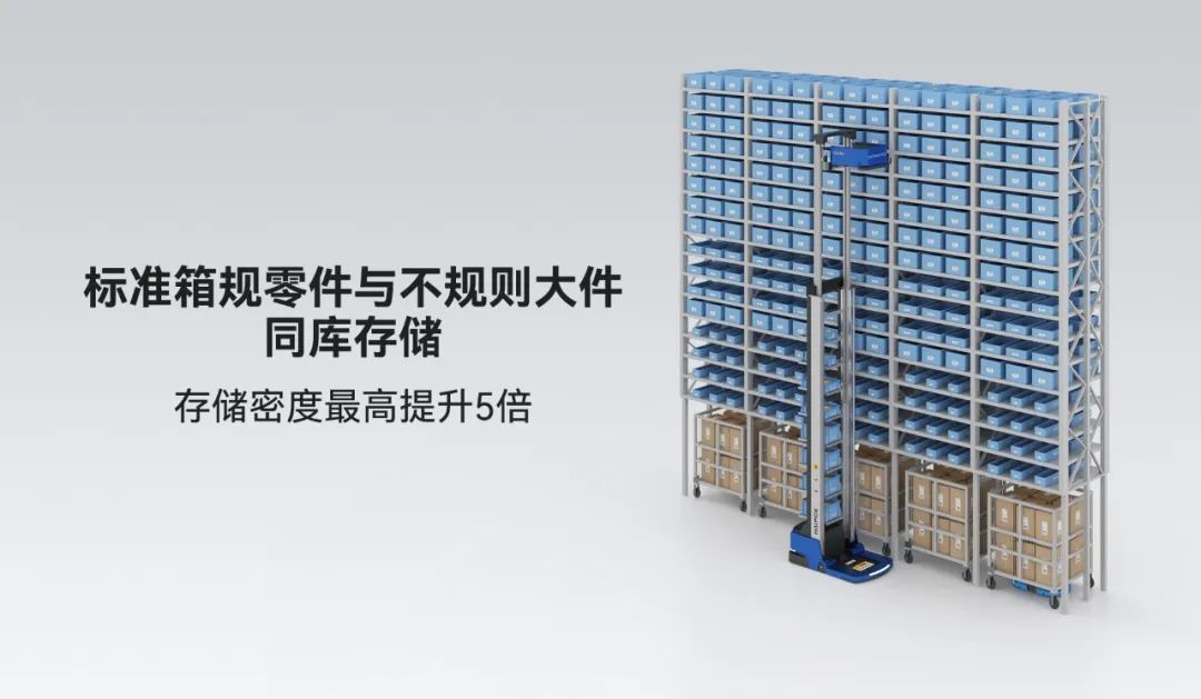HaiPick系统组合方案可以使用A42T应对0-10米高的货架,存储螺丝螺母等小件零部件,同时,货架底部设置托盘/料架存储区域,存储座椅、保险杠、发动机等大件零部件,最大程度利用仓库的空间,存储密度最高提升5倍。