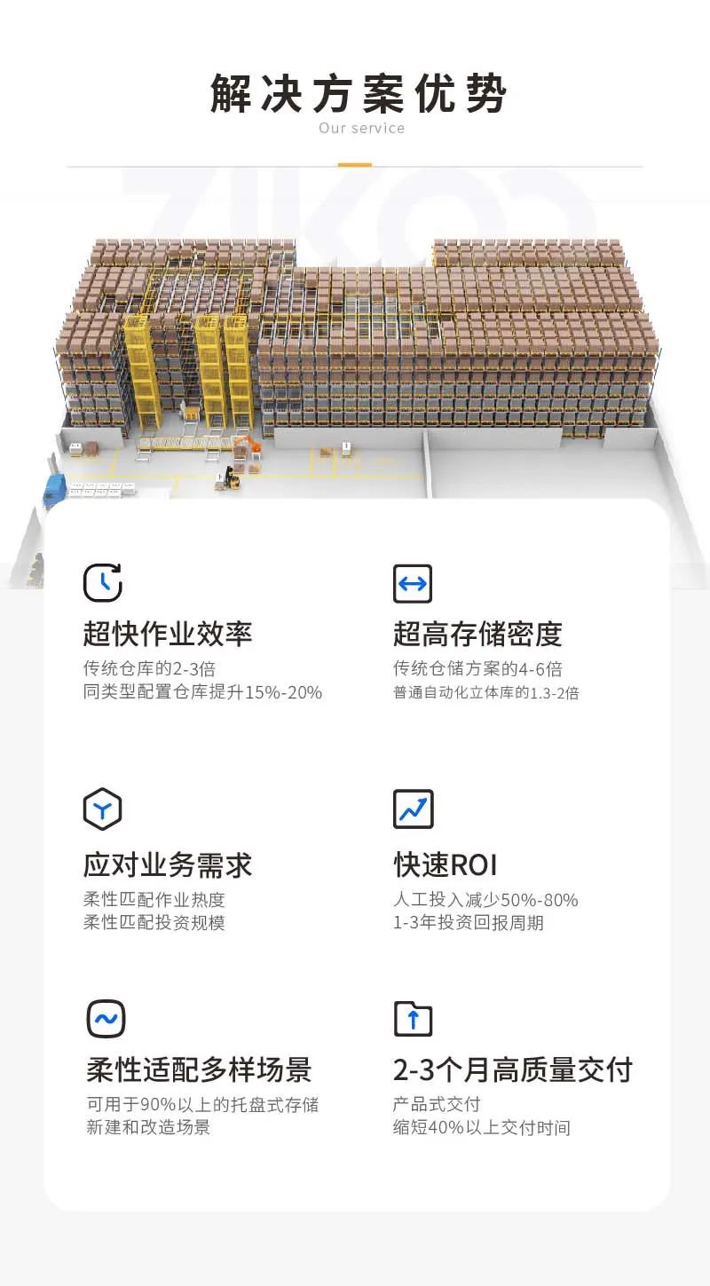 飞梭®系统通过“1+N”的组合模式,稳定高效的托盘四向穿梭车可搭配组合移动机器人(AGV/AMR)、拆码垛机械手、OCR识别称重等,以及对接其他管理软件来优化内部仓储物流,形成“密集存储+货到人拣选”的灵活组合,有效解决企业“超高出入库流量”“人工作业效率低”等痛点,可实现1-3年投资回报周期,是一种简单、高效、高ROI的存储形式。