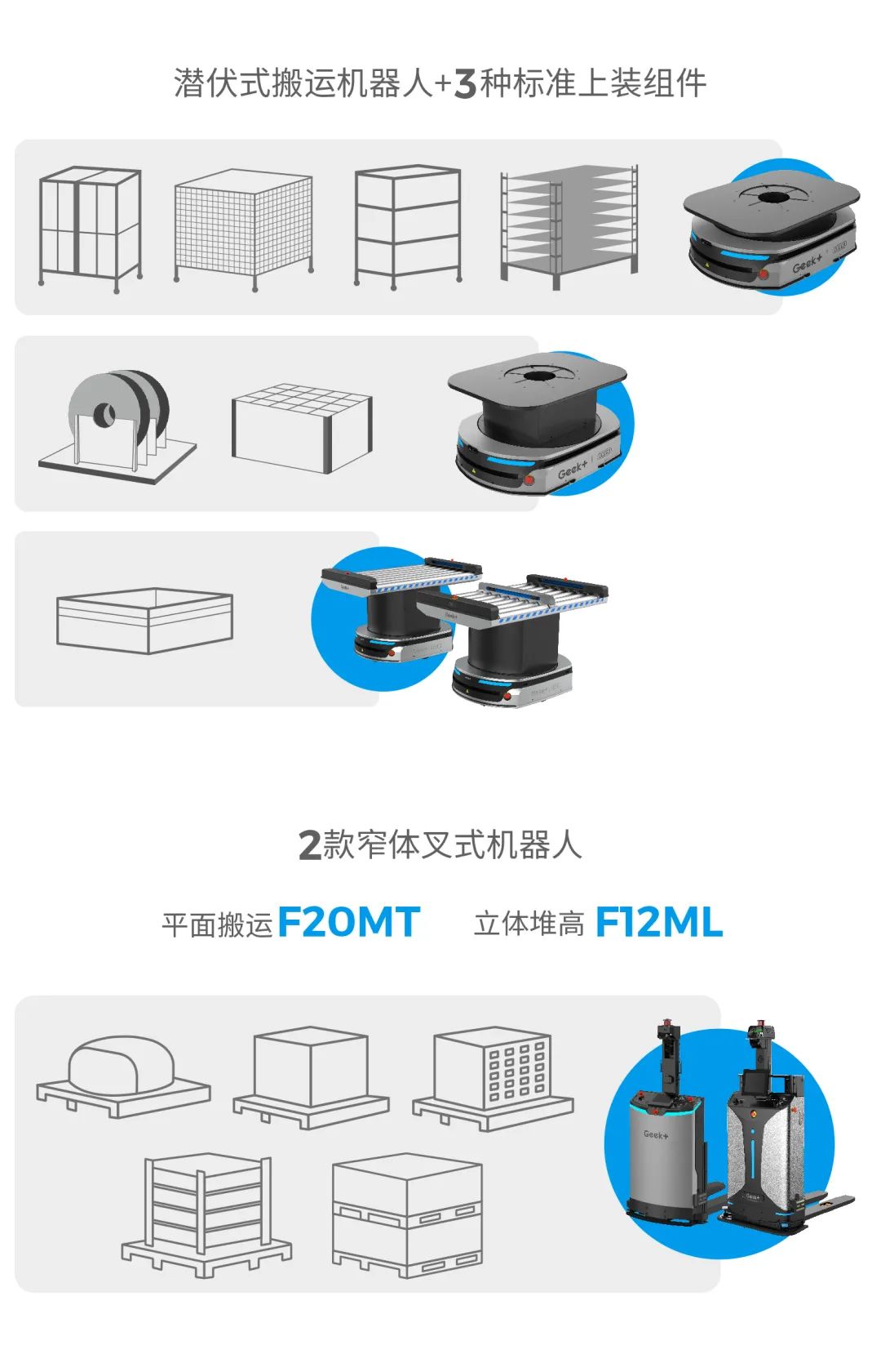 极智嘉提供负载覆盖200~2000kg的潜伏式搬运机器人和无人叉车。潜伏式搬运机器人可搭配模块化上装,满足托盘、料箱、料车、笼车等多种载具的搬运需求和产线对接需求;无人叉车可满足托盘平面搬运和立体堆高需求,实现0-2m的空间高度覆盖。