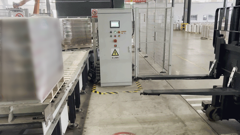 成品入库,三层堆叠:未来机器人RSC2.0中控调度系统对接客户输送线PLC控制系统,当辊筒输送线将成品垛输送至成品下线区时,输送线将成品到位信号通过PLC控制系统发送给RSC2.0系统,系统根据现场无人叉车的作业状态,智能调度空闲VNP20无人叉车前往辊筒输送线叉取成品垛。